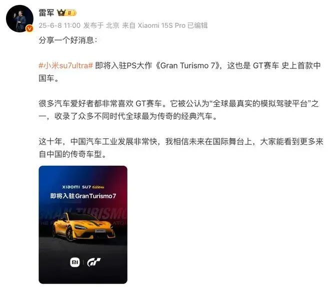 此前,小米SU7、YU7均已经制定了出海计划,小米甚至为此与全球最著名的模拟类赛车游戏联手,为小米汽车在全球范围内扩大影响力。